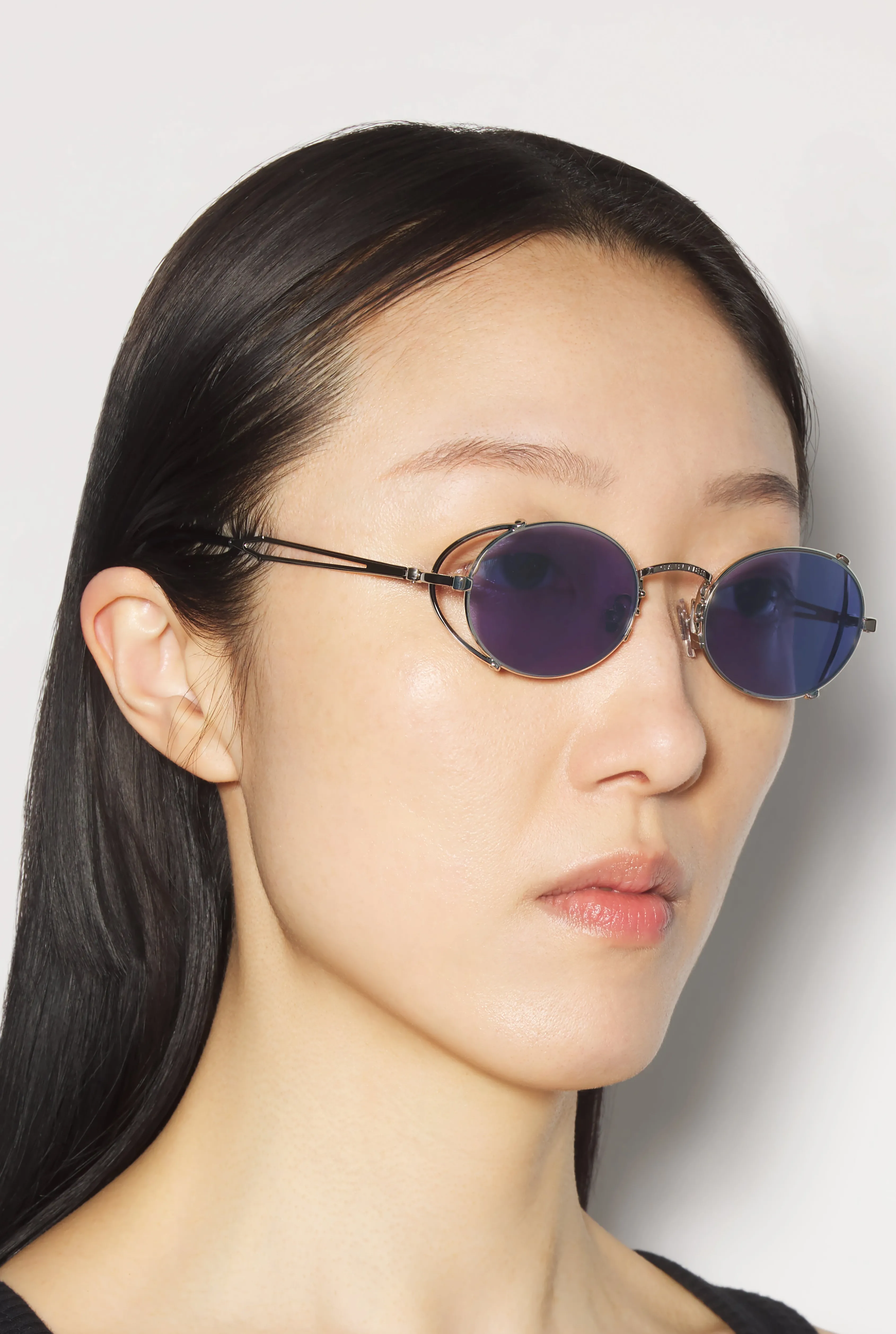 Eyewear CollectionSunglasses with round silver frames and arched metallic temples.