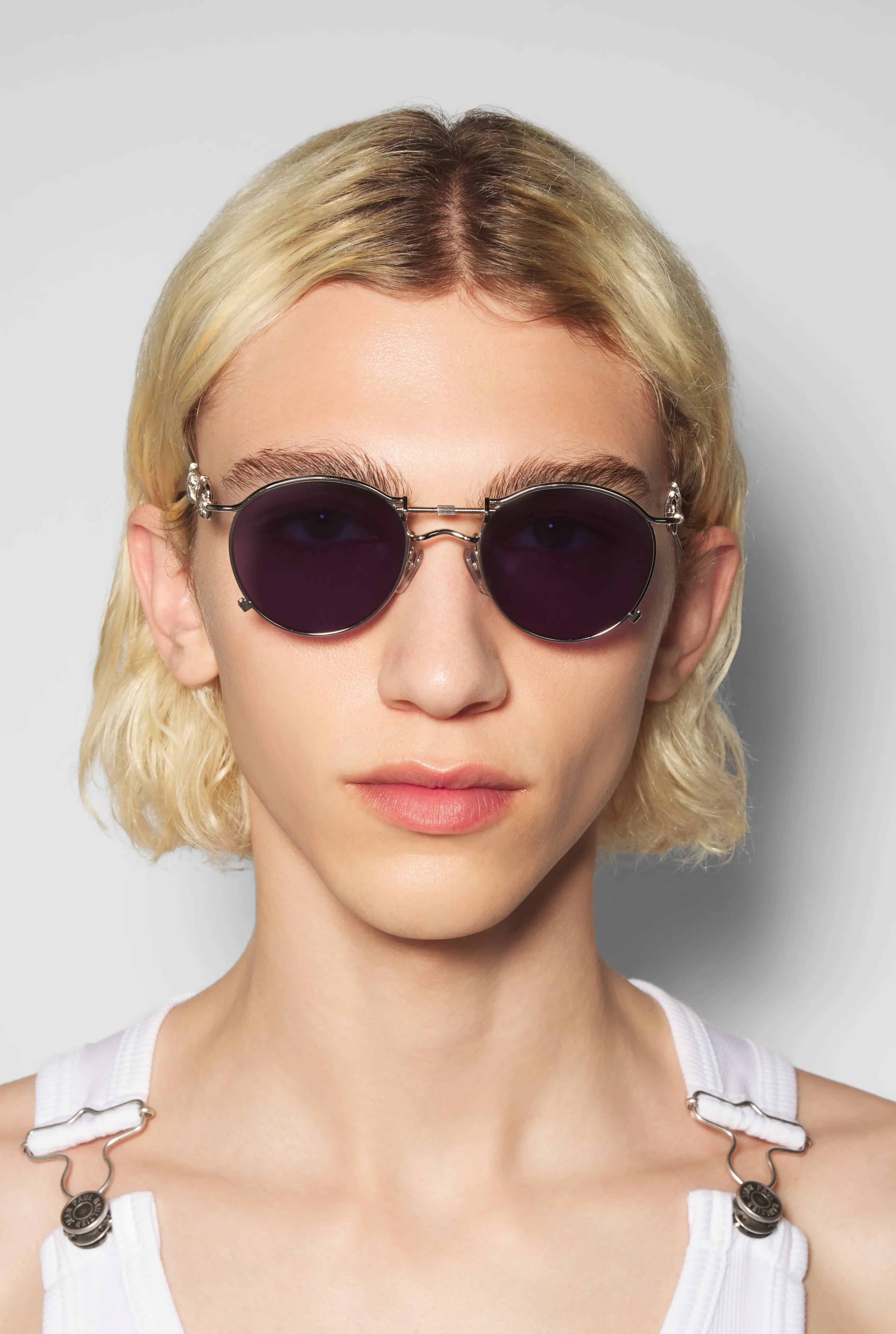 Eyewear Collection Sunglasses with round silver frames and screw thread detail on temples and bridge.