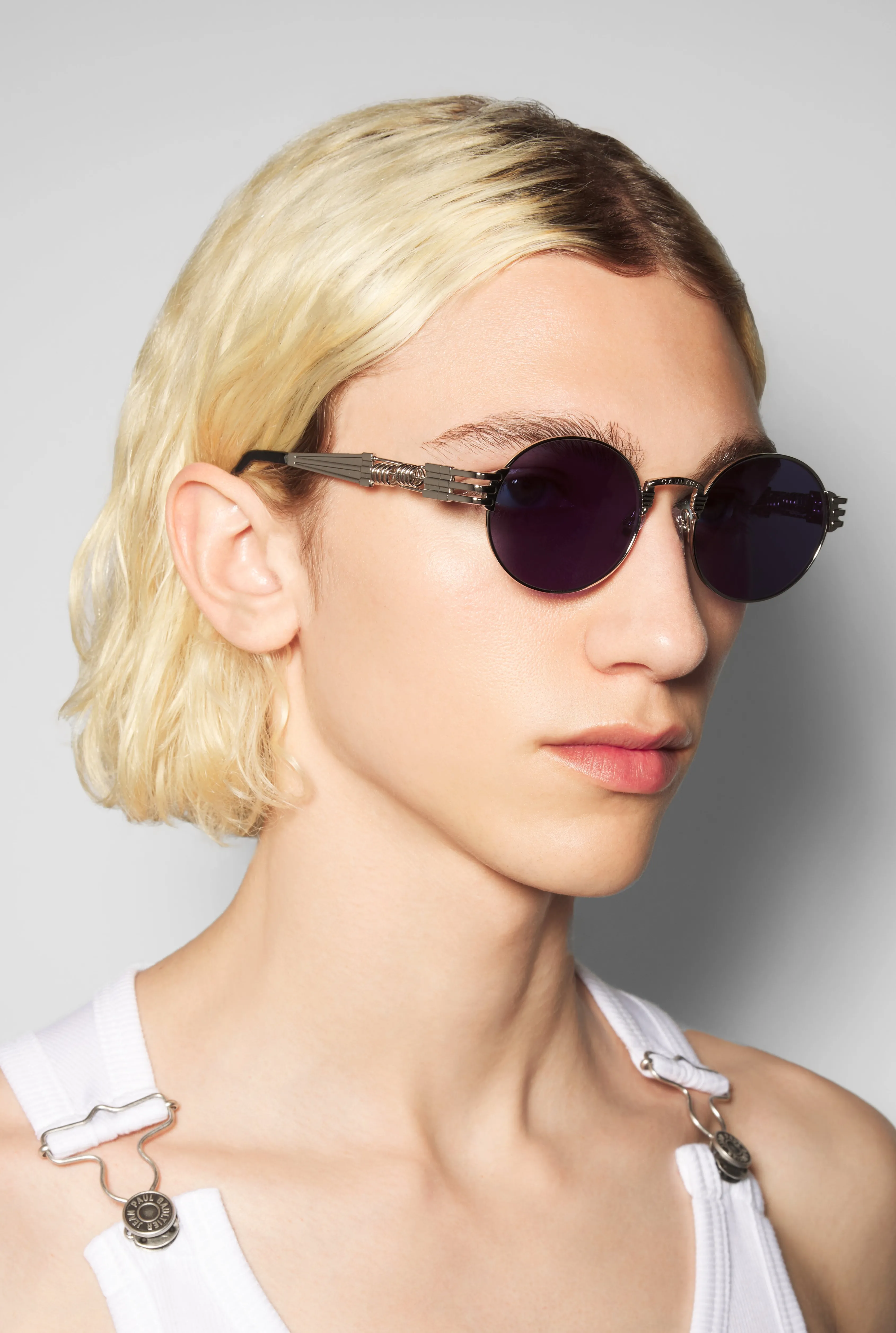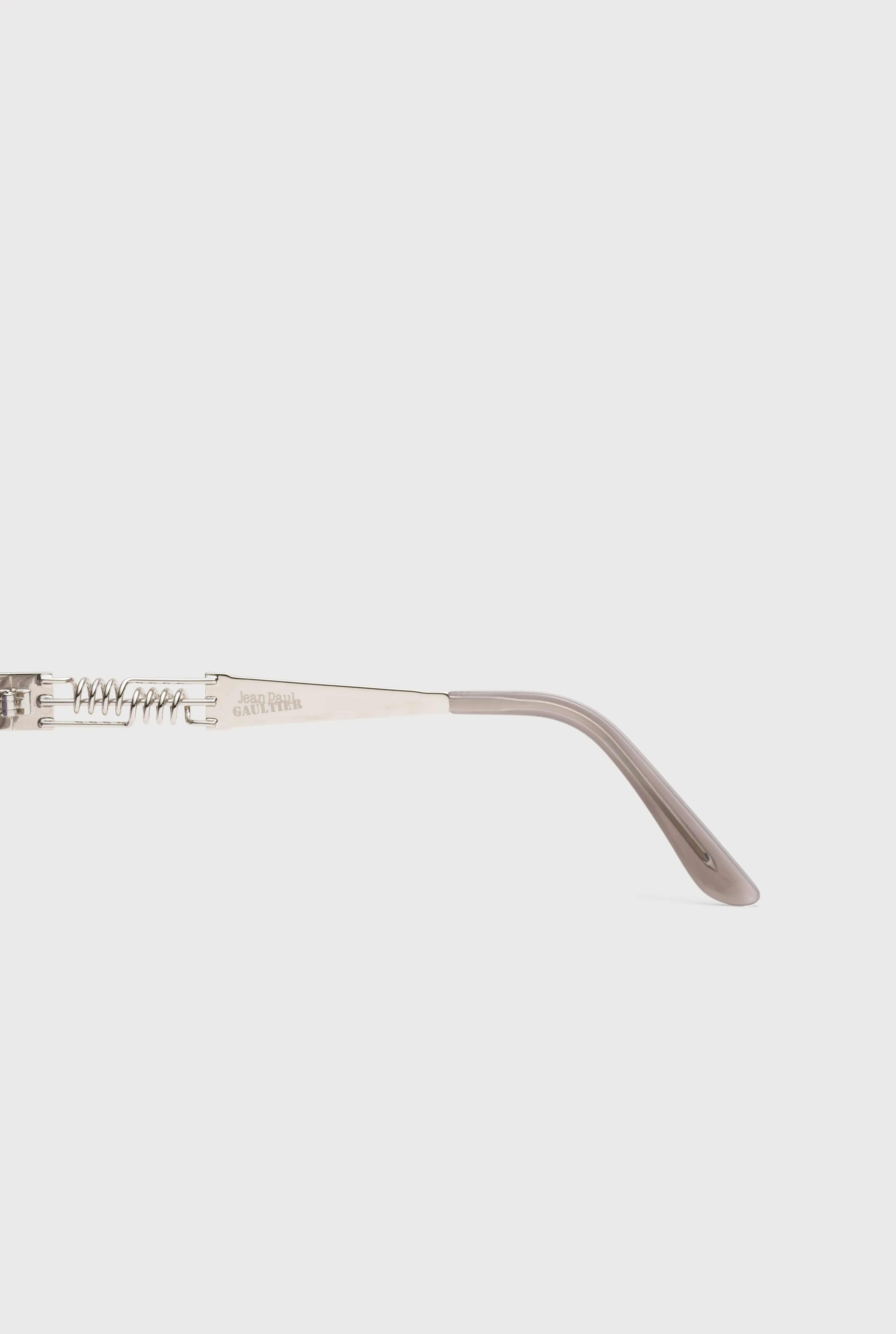 Eyewear CollectionSunglasses with round silver frames and metallic temples with spring detail.