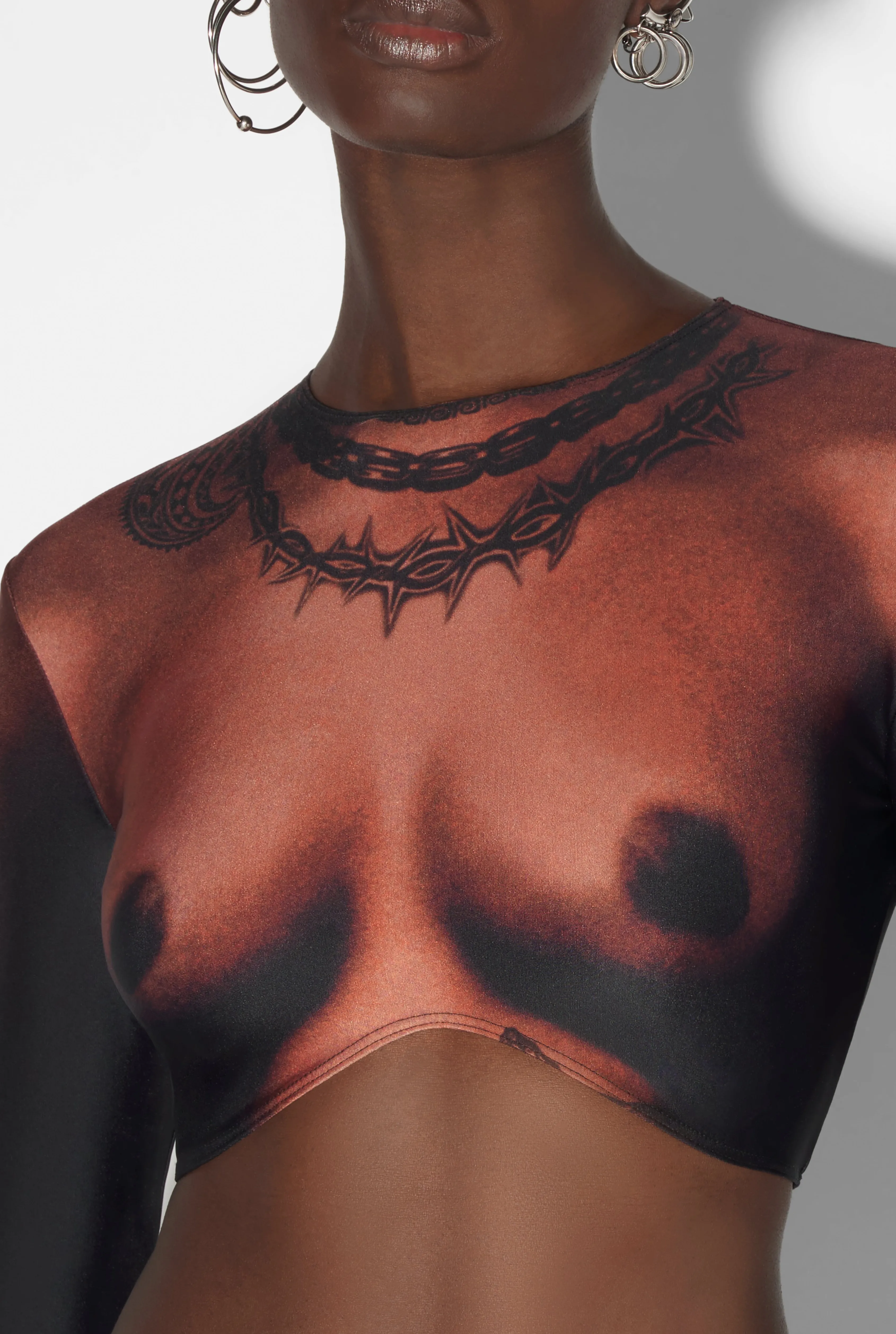 Crop top with tattooed nude body trompe l’Oeil print.
