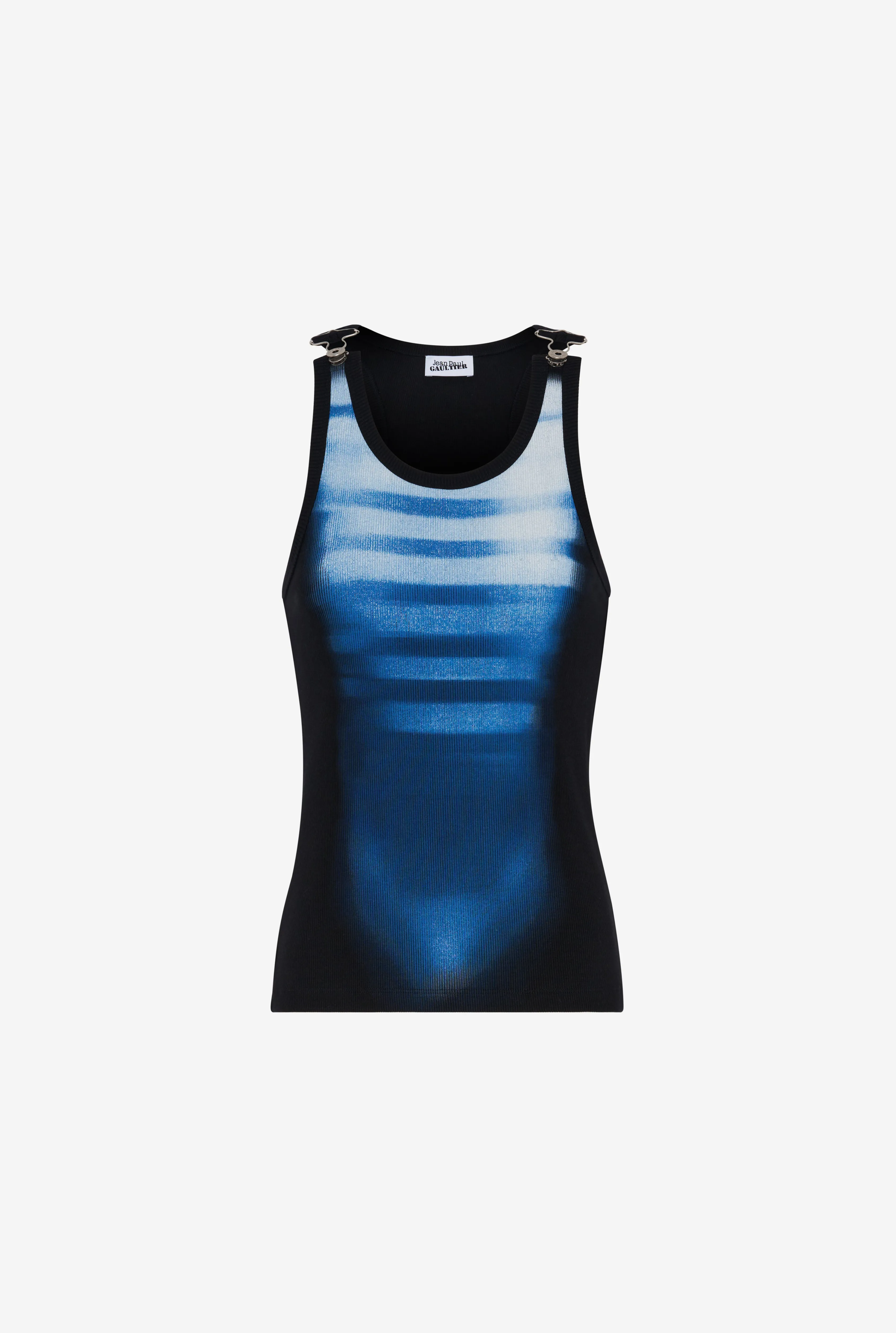 Blue ribbed cotton tank top with “Le Mâle” print and overalls-inspired buckles with Jean Paul Gaultier engraving.