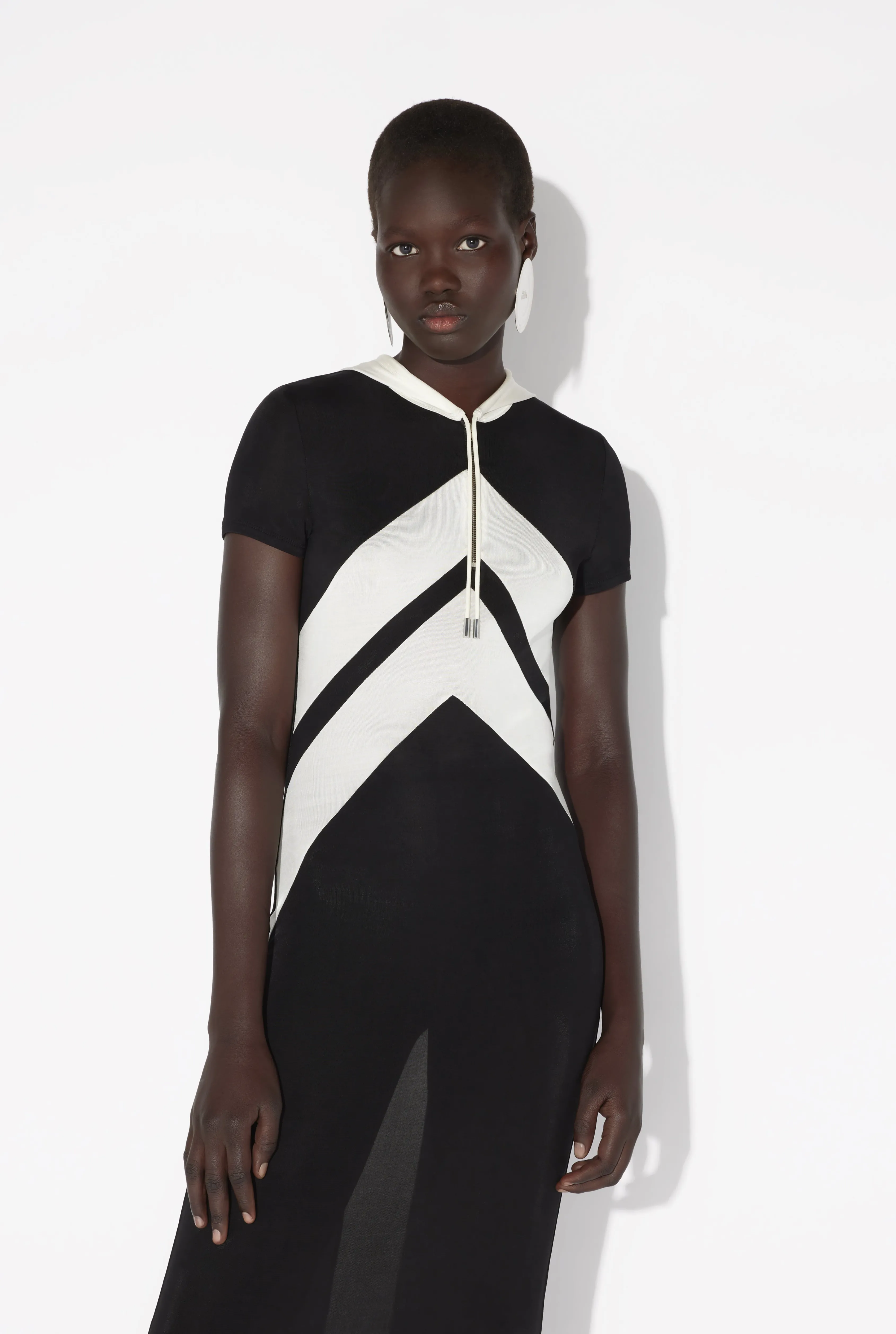 Long hooded dress in black viscose with white chevron pattern.