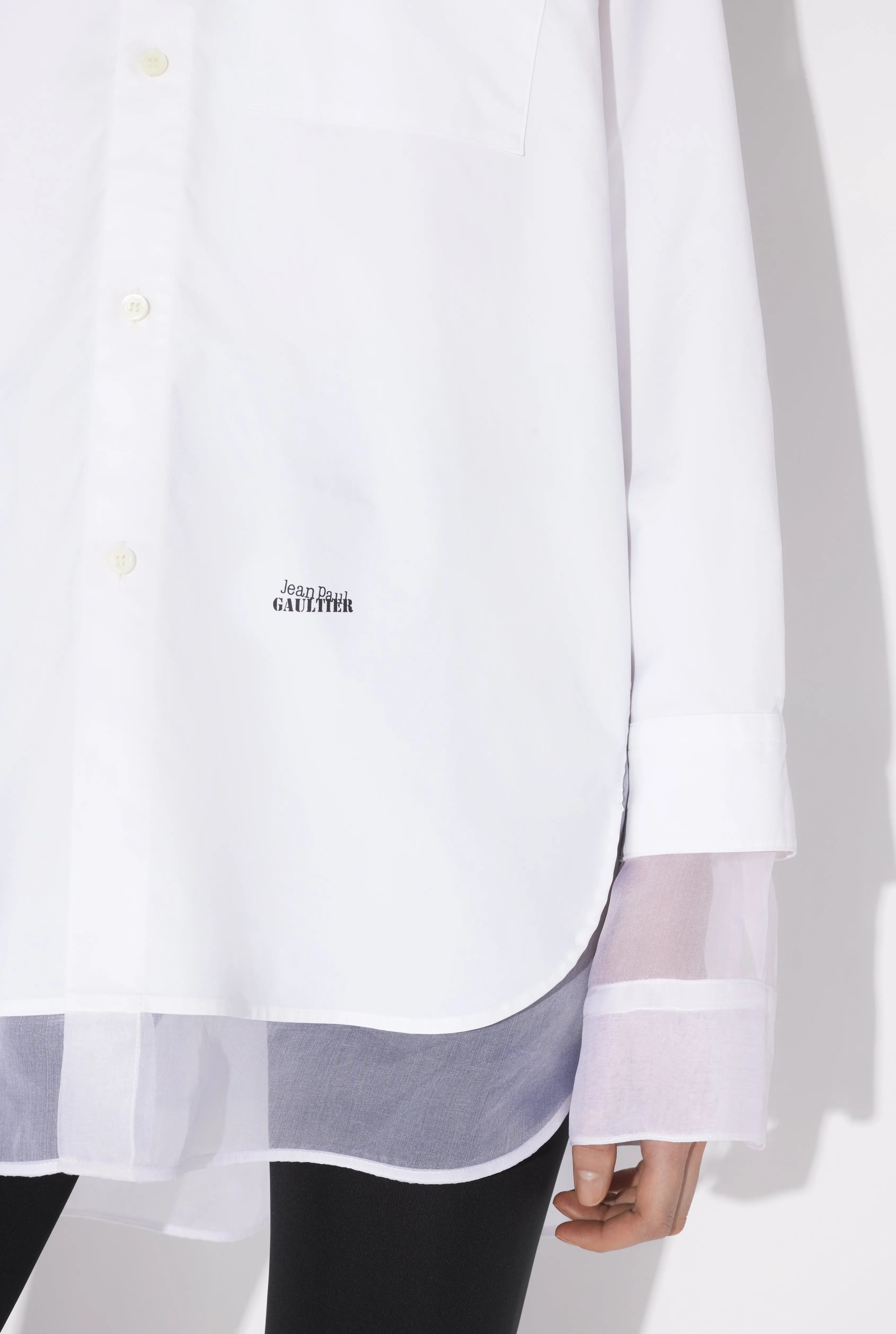 White poplin shirt with silk see-through effects and Jean Paul Gaultier logo detail in front.