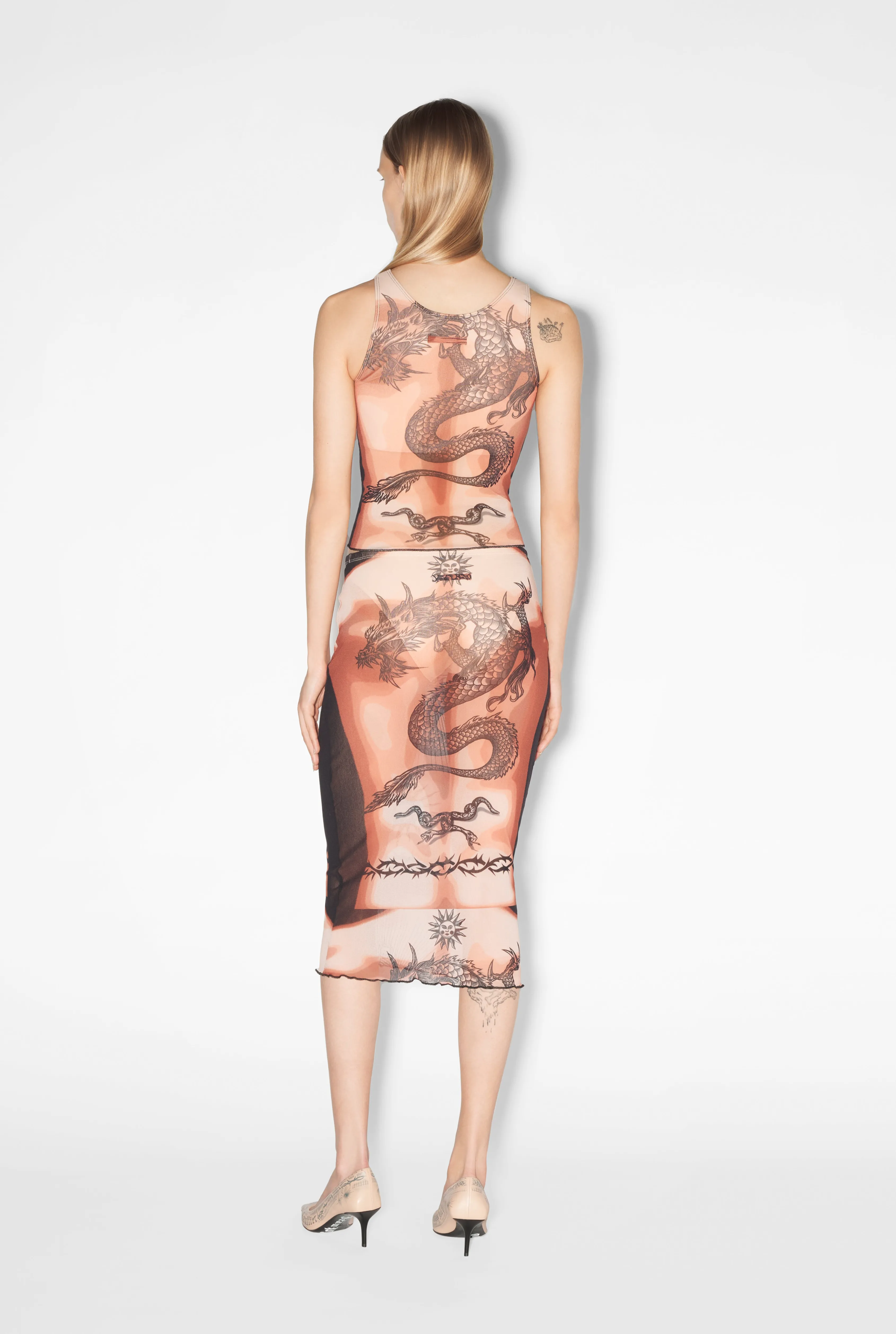 Mid-length tulle skirt with Safe Sex Body Tattoo logo print.
