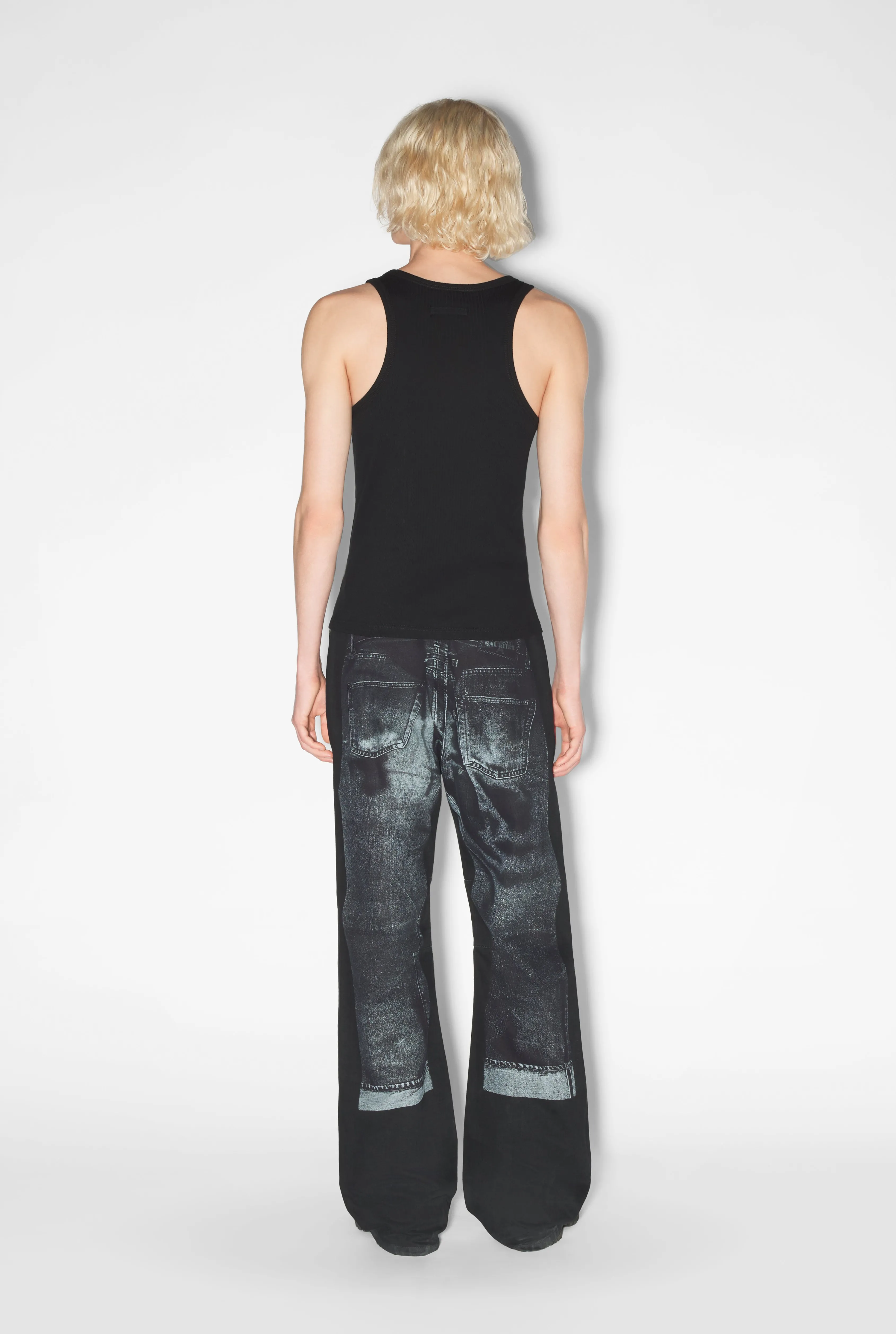 Black cotton tank top with overall buckles and Gaultier engraved metallic button.